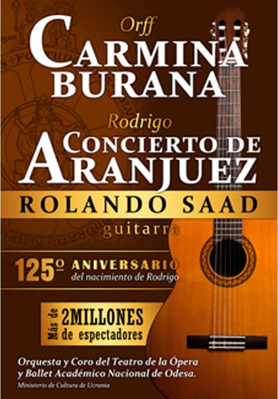 Die epische Kraft von Carl Orff und die spanische Leidenschaft von Joaquín Rodrigo treffen am kommenden Sonntag, dem 8. Februar, um 18.00 Uhr auf derselben Bühne aufeinander. Der Meister der spanischen Gitarre Rolando Saad wird vom Großen Symphonieorchester und dem Chor des Nationalen Akademischen Opern- und Balletttheaters von Odessa (Ministerium für Kultur der Ukraine) begleitet.