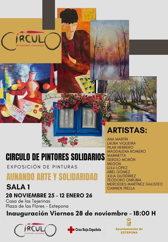 Das Rathaus von Estepona teilt mit, dass im Saal 1 der Casa de Las Tejerinas an der Plaza de Las Flores ab diesem Freitag, den 28. Mai, die kollektive Malereiausstellung „Kunst und Solidarität verbinden“ stattfindet, an der 13 Künstler des Solidaritätsmalerkreises teilnehmen: Ana Martín, Laura Viqueira, Pilar Herrero, Magdalena Romero, Marinetta, Sergio Morón, Megon, Llilli López, Abel Gómez, Julia Gutiérrez, Teodoro Onrubia, Mercedes Martínez Galisteo und Carmen Trella.