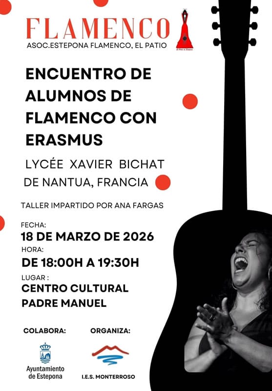 In diesem Zusammenhang werden die Schüler an einem Flamenco-Workshop teilnehmen, der von der Cantaora Ana Fargas, Leiterin der Asociación Estepona Flamenco ‚El Patio‘, zusammen mit ihren Gesangsschülern gegeben wird. In diesem praktischen Workshop lernen die Teilnehmer die wesentlichen Elemente der Flamenco-Kunst kennen und tauschen Erfahrungen aus. Anlässlich des Internationalen Frauentags im März wird in diesem Workshop die wichtige Entwicklung der Frauen in der Welt des Flamenco besonders hervorgehoben.