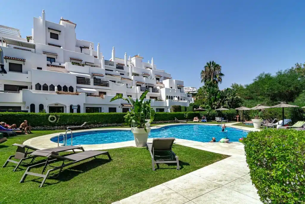 Golf Hills a gated complex with communal gardens, large swimming pool, kids' pool, paddle tenis courts, childrens playground area, situated in Selwo in the hills to the northeast of Estepona.