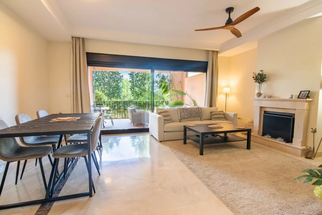 The spacious living room features a fireplace and large patio doors opening onto a sun-drenched terrace with sea and golf views. The terrace is enclosed with glass curtains, creating an additional year-round living area — ideal for relaxing or entertaining.
