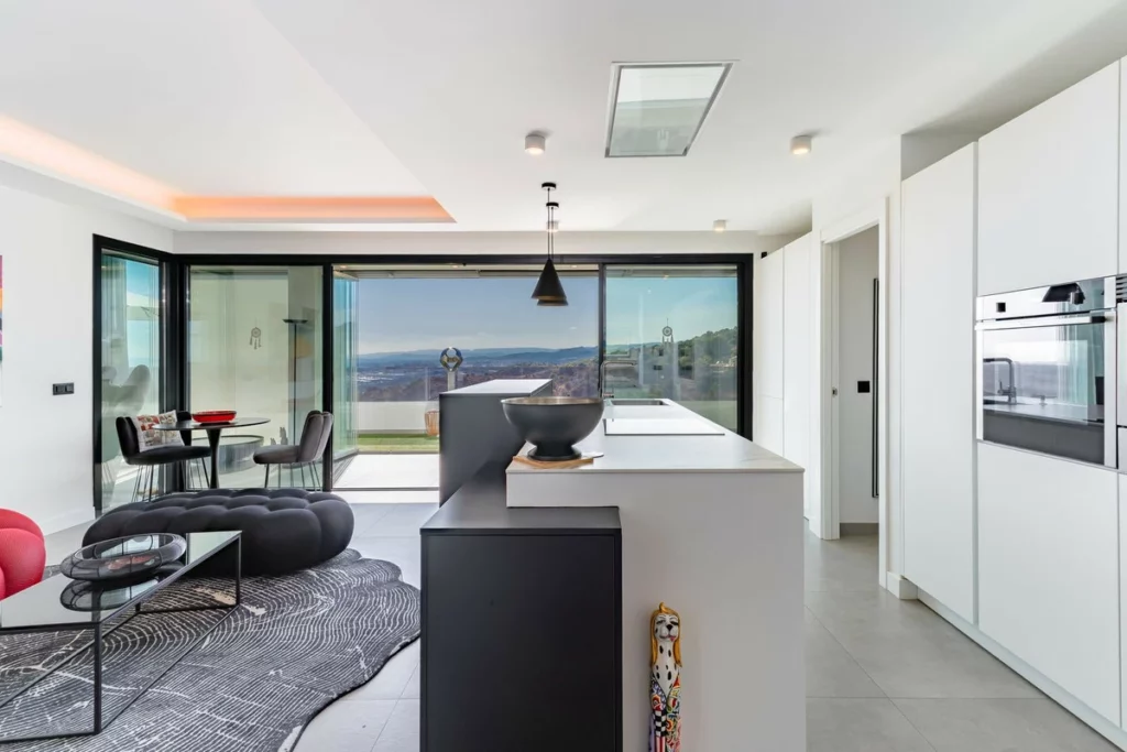 The space comprises 108.46 m² of registered built area plus a 307.60 m² terrace – approximately 400 m² in total. Part of the terrace has been enclosed with Lumon glass curtains and full air conditioning – hot and cold -creating a series of additional living zones usable year-round without sacrificing natural light or views. One of these enclosed spaces has been fitted as a dedicated home office — a fully climate-controlled, glass-enclosed room that functions as a true third room, separate from the main living areas. The remaining 200 m² of open terrace is pure Mediterranean outdoor living.