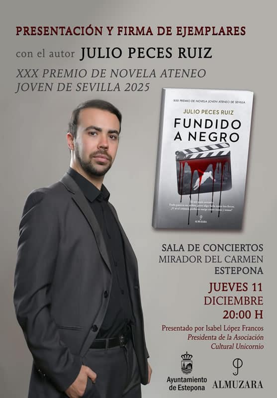 Das Rathaus von Estepona teilt mit, dass am kommenden Donnerstag, den 11. Dezember, um 20.00 Uhr im Kulturzentrum Mirador del Carmen die Vorstellung des neuen Romans „Fundido a negro“ des lokalen Autors Julio Peces Ruiz, der kürzlich mit dem XXX Ateneo Joven de Sevilla Award ausgezeichnet wurde, stattfindet.