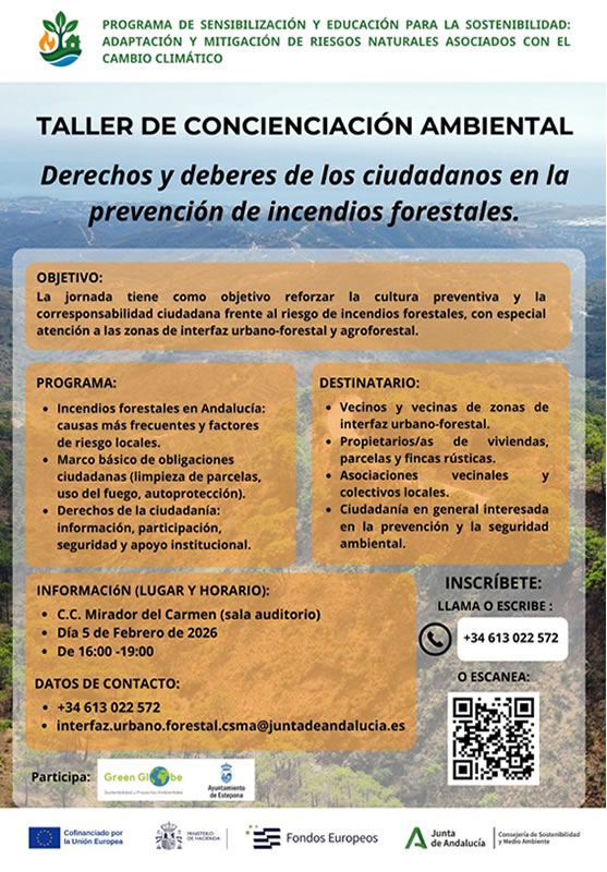 Während des Tages, der von 16.00 bis 19.An diesem Tag, der von 16.00 bis 19.00 Uhr stattfindet, werden Themen wie Waldbrände in Andalusien, die häufigsten Ursachen und lokalen Risikofaktoren, der grundlegende Rahmen der Bürgerpflichten (Rodung von Grundstücken, Einsatz von Feuer, Selbstschutz), die Rechte der Bürger, Partizipation, Sicherheit und institutionelle Unterstützung behandelt.