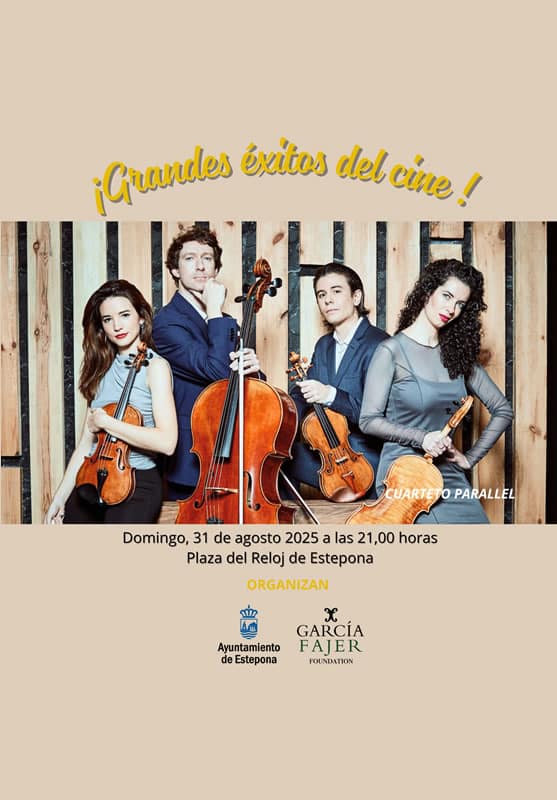 Das Rathaus von Estepona teilt mit, dass die Stiftung García Fajer am kommenden Sonntag, den 31. August um 21:00 Uhr auf der Plaza del Reloj das Streichquartett Parallel Quartet, bestehend aus Alfredo Ancillo, Violine, Laura Hidalgo, Violine, Fátima Poblete, Viola, und Stamen Nikolov, Cello, präsentieren wird.