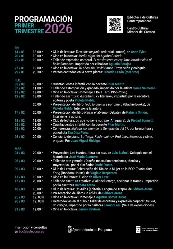 Das Rathaus von Estepona hat das Kulturprogramm vorgestellt, das die im Kulturzentrum Mirador del Carmen untergebrachte Bibliothek für zeitgenössische Kulturen im ersten Quartal 2026 anbieten wird. Insgesamt 25 Veranstaltungen, darunter Buchclubs, Filmvorführungen, Workshops, Musik, Tanz, Geschichtenerzählen und literarische Vorträge. Zu den herausragenden Namen auf dem Programm gehören der Tänzer Agustín Barajas, der Musiker und Leiter der Gruppe McEnroe, Ricardo Lezón, die Tänzerin Leonor Leal und die Dichterin Violeta Nieblas aus Málaga.
